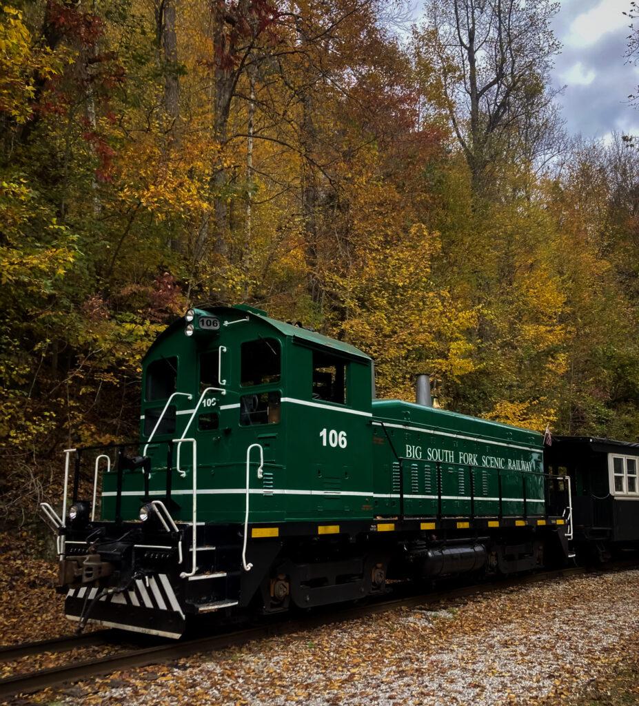 Embark on the Fall Color Run aboard the Big South Fork Scenic Railway — a three‑hour round-trip excursion showcasing Kentucky’s autumn beauty. Beginning at the historic Stearns depot, your journey winds across 16 miles of forested gorge as the train descends roughly 600 feet into the dramatic Big South Fork landscape to reach the Blue Heron Coal Mining Camp.